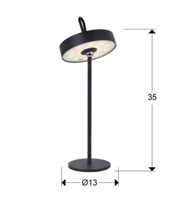 GONG- SOBREMESA LED NEGRO - SCHULLERSobremesa LED para exterior, pantalla portátil con asa de silicona y soporte magnético. Realizado en metal acabado negro y difusor acrílico opal. 2,5W LED, 140lm, 3000K. DIMABLE. IP54. Material/Tonalidad - Materiales: Metal, ABS/Metal, ABS - Acabado: Negro, Opal./Black, Opal. Iluminación - Potencia Eléctrica: 2.5W - Lúmenes: 140 - Tonalidad de la luz: 3000 K - Tensión: 5 V - Frecuencia: 50/60 Hz - Vida Media: 50000 Horas - CRI: 80 Medidas - Articulo: Diámetro 13 cms / Alto 35 cms - Peso: 0,67 Kg - Pantalla/Tulipa: Diámetro 13 cms / Alto 3 cms Otros Datos de Interés - IP: IP 54 - Código EAN: 8435435339173.0 - Colección: Gong