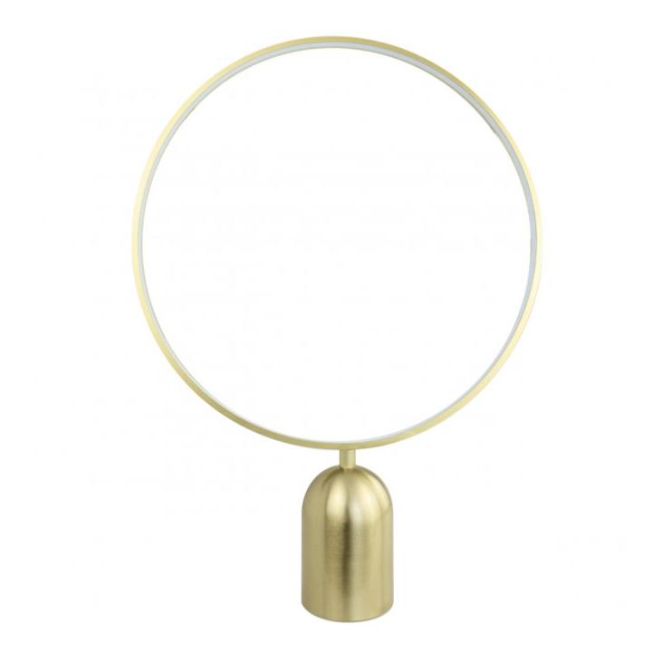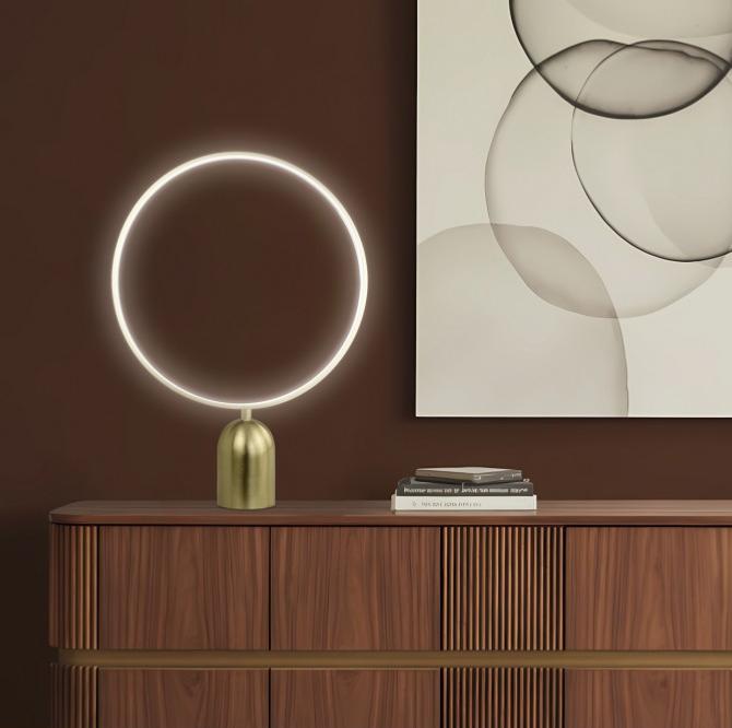 Sobremesa de la Colección HALO, fabricado en metal con acabado Latón. Un diseño único con aro LED que irradia luz de forma uniforme.LED integrado 18W, 4000K.