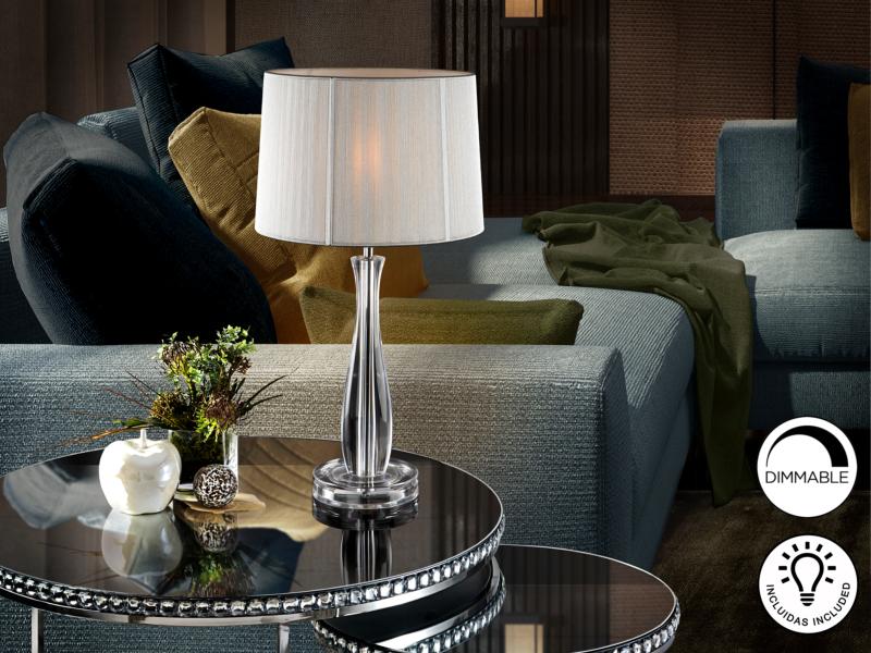 SOBREMESA ·LIN· TRANSP. C/P - SCHULLERLámpara sobremesa de 1 luz realizada en metacrilato. Pantalla de hilo tensado, de color plata. Material/Tonalidad - Materiales: Metacrilato e hilo/Methacrylat - Acabado: Transparente y plata/Clear and - Tonalidad de Cable: Transparente Iluminación - Número de Bombillas: 1 - Tipo de Bombillas: E27 - Potencia por Bombilla: 7W - Voltaje de Bombilla/s incluidas: 220 V - Potencia Eléctrica: 20W - Lúmenes: 560 - Lúmenes por Bombilla: 560.0 - Tensión: 220/240 V - Frecuencia: 50/60 Hz - Frecuencia de Bombilla: 50/60 Hz Medidas - Articulo: Diámetro 27 cms / Alto 51 cms - Peso: 1,76 Kg - Pantalla/Tulipa: Diámetro 27 cms / Alto 19 cms Otros Datos de Interés - IP: IP 20 - Código EAN: 8435435307103.0 - Colección: Lin