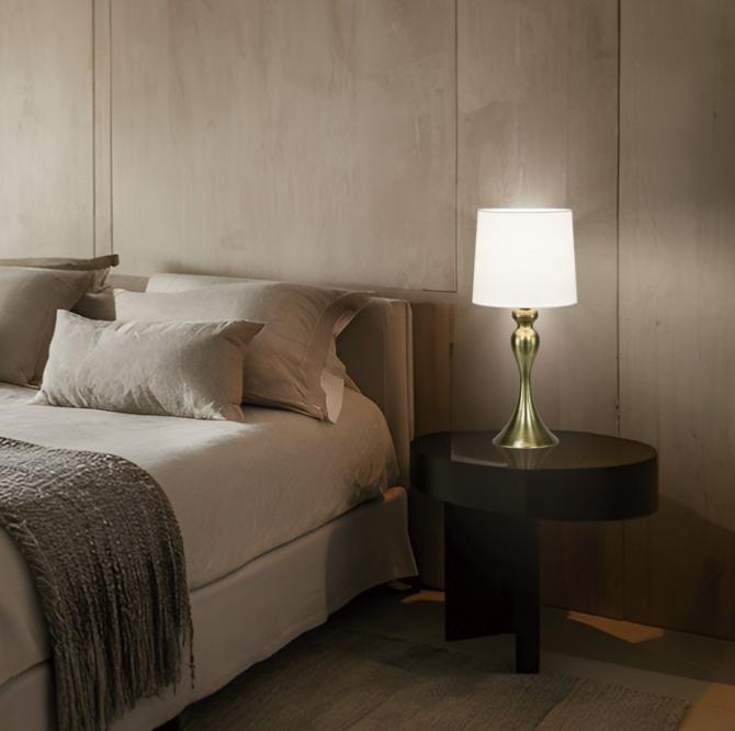 Sobremesa de la Colección LOLA, fabricada en metal con acabado en Cuero y pantalla de tela blanca de Ø20 cm.1 x E-27 / 60W (no incluida), compatible con bombillas LED.Cable en color negro con interruptor ON/OFF.