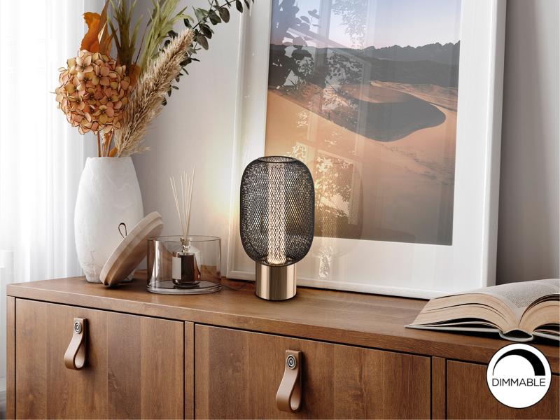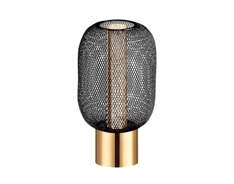 MICRON-SOBREMESA ORO/NEGRO - SCHULLERLámpara de sobremesa de 1 luz realizada en metal acabado oro brillo y negro. Doble tulipa con cilindro interior de acrílico transparente con burbujas y óvalo exterior de malla metálica negra. 5W LED, 450 lm, 3.000 K. Material/Tonalidad - Materiales: Metal, acrílico./Metal, acryli - Acabado: Oro-negro, transparente./Gold- Iluminación - Potencia Eléctrica: 5W - Lúmenes: 450 - Tonalidad de la luz: 3000 K - Tensión: 220/240 V - Frecuencia: 50/60 Hz - Vida Media: 50000 Horas - CRI: 80 Medidas - Articulo: Diámetro 13 cms / Alto 24 cms - Peso: 0,78 Kg - Pantalla/Tulipa: Diámetro 12 cms / Alto 18 cms Otros Datos de Interés - IP: IP 20 - Código EAN: 8435435339227.0 - Colección: Micrón