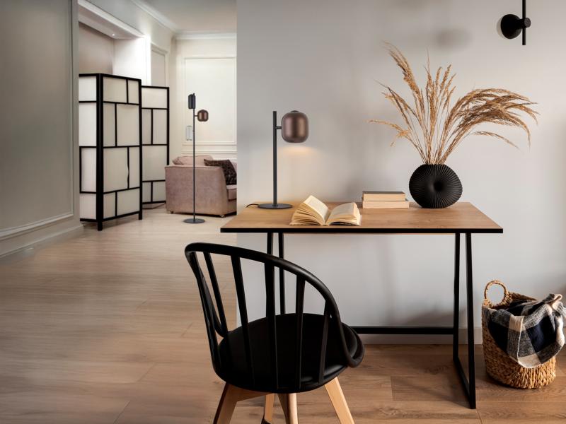 NIMES- SOBREMESA 1L NEGRO-MARRON - ILUMINACION i3 By SCHULLERLámpara de sobremesa realizada en metal acabado negro mate. Tulipa de metal marrón oscuro. Portalámparas GU10. Material/Tonalidad - Materiales: Metal./Metal, - Acabado: Negro mate, marrón oscuro./Mat Iluminación - Potencia Eléctrica: 10W - Tensión: 110/220 V - Frecuencia: 50/60 Hz Medidas - Articulo: Ancho 23,5 cms / Fondo 15 cms / Alto 41,5 cms - Peso: 1,54 Kg - Pantalla/Tulipa: Diámetro 12 cms / Alto 13 cms - Florón de techo: Diámetro 15 cms Otros Datos de Interés - IP: IP 20 - Código EAN: 8435435344160.0 - Colección: Nimes
