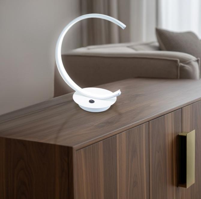 Sobremesa LED de la Colección UBER, fabricada en metal con acabado blanco. Diseño funcional con interruptor de encendido y apagado en la base.LED integrado 5W, 4000K.Cable de color negro.Ideal como iluminación indirecta en dormitorios, salones