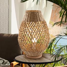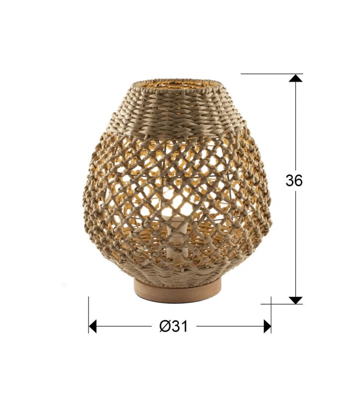 Lámpara de sobremesa pequeño de 1 luz, realizado en metal y madera, con pantalla de cuerdas de papel trenzado acabado beis.