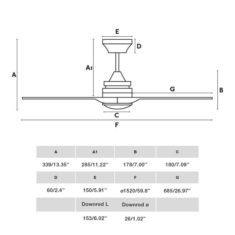Materiales | - Base Motor: Acero - Aspas: Madera natural - Difusor inferior: Policarbonato | | Tonalidad de Metal | Negro Mate | Accionado mediante | Mando a distancia. | Programador de apagado | Si | Numero de Aspas | 3 | Tonalidad de Aspas | Madera arce | Motor Tipo | DC - Bajo Consumo | Velocidades | 6 | Velocidades / Consumo | - 1ª velocidad 97 rpm - 6w - 2ª velocidad: 120 rpm - 10w - 3ª velocidad: 136 rpm - 13w - 4ª velocidad: 158 rpm - 19w - 5ª velocidad: 179 rpm - 26w - 6ª velocidad: 196 rpm - 35w | | Flujo de Aire | 222 m3/Minuto | Función Invierno | Si. | Luz | Si - Luz LED SMD de 20w. | | Lúmenes | 806 lúmenes - Dimable | | Tonalidad de la luz | Seleccionable 2700-4000-6500k | Posible montaje sin Barra | No | Posible montaje en techo inclinado | Si* | Grafico de medidas Ventilador Alo Faro |