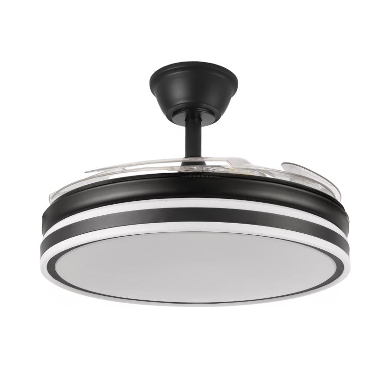 | Ventilador de Techo Bayomo Fabrilamp | Ventilador BAYOMO realizado en metal y policarbonato, en color BLANCO con cuatro aspas DESPLEGABLES ABS transparente muy resistentes. Motor DC. Tiene seis velocidades ajustables. Tecnología LED integrada con una potencia de 59W, con 3 TEMPERATURAS DE LUZ (3000-4000-6000K) y 6980 lúmenes. Control de aire verano o invierno. Mando a distancia INCLUIDO, REGULABLE EN INTENSIDAD, con MEMORIA DE COLOR incorporada y TEMPORIZADOR 2/4 H. Modelo disponible en color níquel, cuero, y blanco, y todos en dos medidas distintas. | Características Ventilador Bayomo Fabrilamp | Materiales | - Base Motor: Metal - Aspas: Acrilicas - Difusor inferior: Policarbonato | | Tonalidad de Metal | Negro | Accionado mediante | Mando a distancia. | Programador de apagado | Sí. | Numero de Aspas | 4 | Tonalidad de Aspas | Transparentes | Motor Tipo | DC - Bajo Consumo | Velocidades | 6 | Consumo / Flujo aire Revoluciones / Sonoridad | - 1ª velocidad: 7w - 3754m3/hora - 160 rpm - 20 dB - 2ª velocidad: 12w - 4803m3/hora - 180 rpm - 25 dB - 3ª velocidad: 17w - 6336m3/hora - 200 rpm - 30 dB - 4ª velocidad: 22w - 7665m3/hora - 220 rpm - 35 dB - 5ª velocidad: 27w - 8848m3/hora - 240 rpm - 40 dB - 6ª velocidad: 32w - 9953m3/hora - 260 rpm - 45 dB | Función Invierno | Sí | Luz | Si - Luz LED de 72 | Datos de Luz | 7200 lumenes | | Tonalidad de la Luz | Seleccionable (3000-4000-6000k) Con Memoria | Posible montaje sin Barra | No | Posible montaje en techo inclinado | No | Grafico de medidas Ventilador Bayomo Fabrilamp |