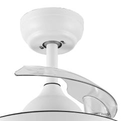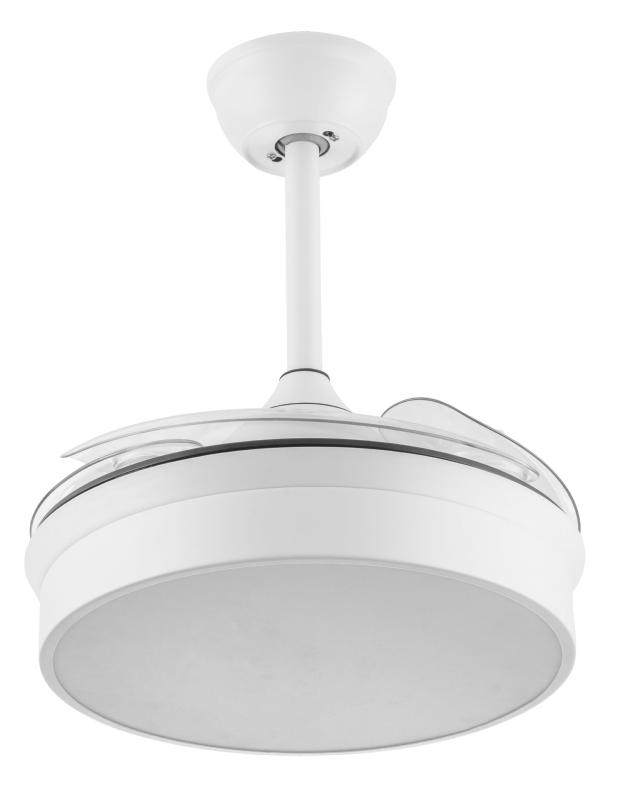 | Ventilador de Techo Cala Fabrilamp | Ventilador de techo de motor gama alta y bajo consumo con 6 velocidades y programador de apagado automático. Aspas retractiles que se despliegan al ponerse en marcha el ventilador. Equipado con luz LED, pudiendo seleccionar la tonalidad de la luz. Fría-neutra-cálida con memoria. Ventilador de menor tamaño, solo 41cm con las aspas cerradas. Se envía con 2 barras para adaptar a la altura más idónea. | Caracteristicas Ventilador Cala Fabrilamp | Materiales | - Base Motor: Metal - Aspas: Acrilicas - Difusor inferior: Policarbonato | | Tonalidad de Metal | Blanco | Accionado mediante | Mando a distancia. | Programador de apagado | Sí. | Numero de Aspas | 3 | Tonalidad de Aspas | Transparentes | Motor Tipo | DC - Bajo Consumo | Velocidades | 6 | Consumo / Flujo aire Revoluciones / Sonoridad | - 1ª velocidad: 5.2w - 1200m3/hora - 170 rpm - 34.3 dB - 2ª velocidad: 6.5w - 1500m3/hora - 190 rpm - 35.1 dB - 3ª velocidad: 8.6w - 2100m3/hora - 210 rpm - 35.9 dB - 4ª velocidad: 11.2w - 2600m3/hora - 230 rpm - 37.2 dB - 5ª velocidad: 14.5w - 3100m3/hora - 250 rpm - 38.3 dB - 6ª velocidad: 17.7w - 4500m3/hora - 270 rpm - 40 dB | Función Invierno | Sí | Luz | Si - Luz LED de 48w. | Datos de Luz | 4800 lumenes | | Tonalidad de la Luz | Seleccionable (3000-4000-6000k) Con Memoria | Posible montaje sin Barra | No | Posible montaje en techo inclinado | Sí* | Grafico de medidas Ventilador Cala Fabrilamp |