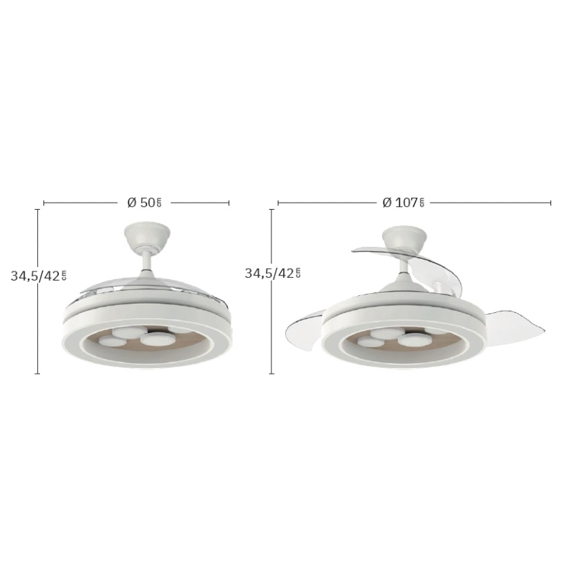 | Ventilador de Techo Cupido Fabrilamp | | Ventilador DC de la serie CUPIDO realizado en metal, policarbonato y ABS, en color BLANCO/HAYA con tres aspas DESPLEGABLES de ABS transparente muy resistentes. Diseño muy moderno y original, con bonito juego de luces. Tiene seis velocidades ajustables. Tecnología LED integrada con una potencia de 55W, con 3 TEMPERATURAS SELECCIONABLES DE LUZ (3000-4500-6500K) y 4960 lúmenes. Control de aire verano o invierno. Su medida es de 34,5/42X50 centímetros con las aspas plegadas y de 34,5/42X107 centímetros con las aspas desplegadas. Incluye dos tijas de 12,5 y 20 centímetros, para colocar a distintas alturas. Mando a distancia INCLUIDO, REGULABLE EN INTENSIDAD, con MEMORIA DE COLOR incorporada y TEMPORIZADOR 2/4 H. Puede utilizar el control VIA APP : FAN LAMP PRO, desde el que podrá manejar también su ventilador de manera fácil e intuitiva desde su móvil. Modelo disponible en color blanco/haya y negro/madera. | Caracteristicas Ventilador Cupido Fabrilamp | Materiales | - Base Motor: Metal - Aspas: Acrílicas - Difusor inferior: Policarbonato | | Tonalidad de Metal | Blanco | Accionado mediante | Mando a distancia. | Programador de apagado | Sí. 2 h / 4 h | Numero de Aspas | 3 | Tonalidad de Aspas | Transparentes | Motor Tipo | DC - Bajo Consumo | Velocidades | 6 | Consumo / Flujo aire Revoluciones / Sonoridad | - 1ª velocidad: 7w - 3754 m3/hora - 160 rpm - 20 dB - 2ª velocidad: 12w - 4803 m3/hora - 170 rpm - 25 dB - 3ª velocidad: 17w - 6336 m3/hora - 180 rpm - 30 dB - 4ª velocidad: 22w - 7665 m3/hora - 190 rpm - 35 dB - 5ª velocidad: 27w - 8848 m3/hora - 200 rpm - 40 dB - 6ª velocidad: 32w - 9953 m3/hora - 210 rpm - 45 dB | Función Invierno | Sí | Luz | Si - Luz LED de 55w. | Datos de Luz | 4960 lúmenes | | Tonalidad de la Luz | Seleccionable (3000-4000-6000k) Con Memoria | Posible montaje sin Barra | No | Posible montaje en techo inclinado | Sí* | Grafico de medidas Ventilador Cupido Fabrilamp |