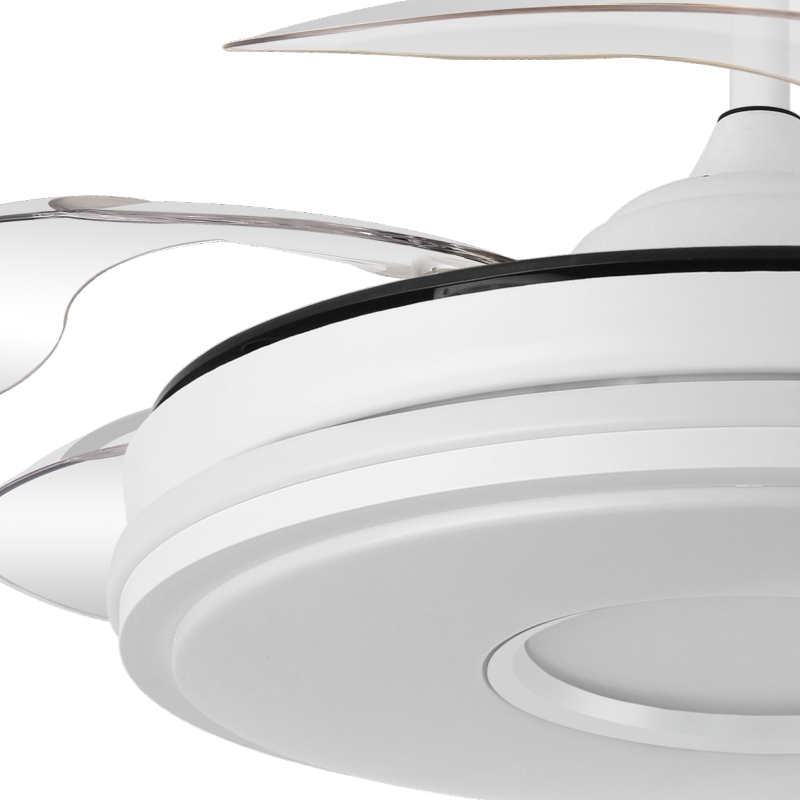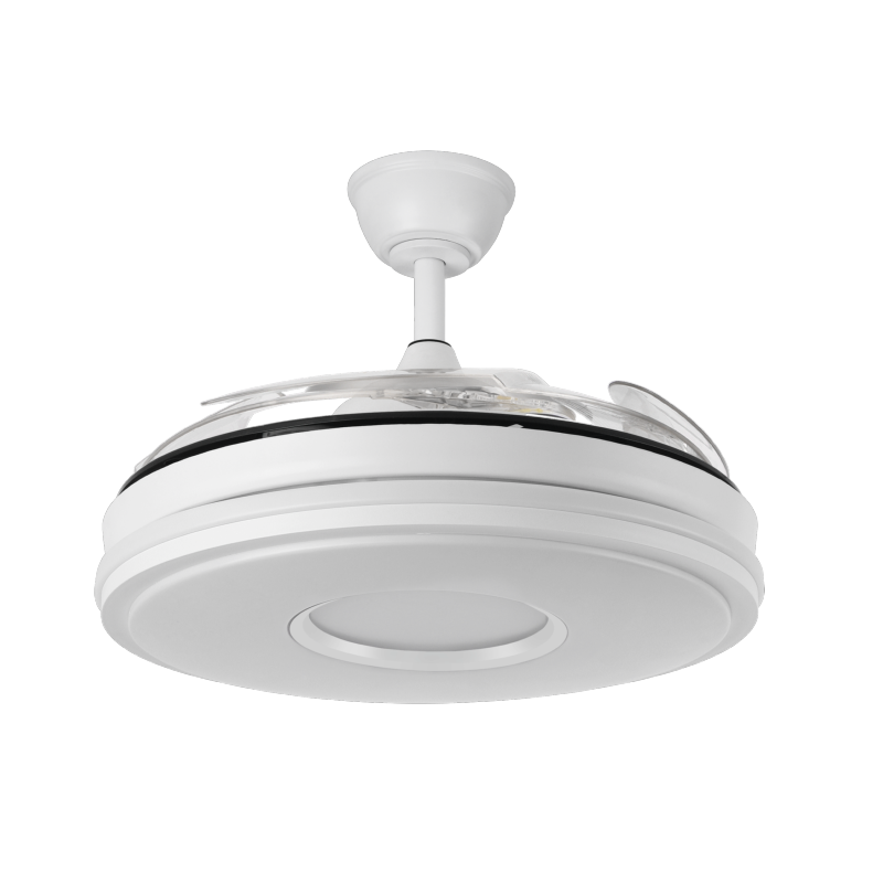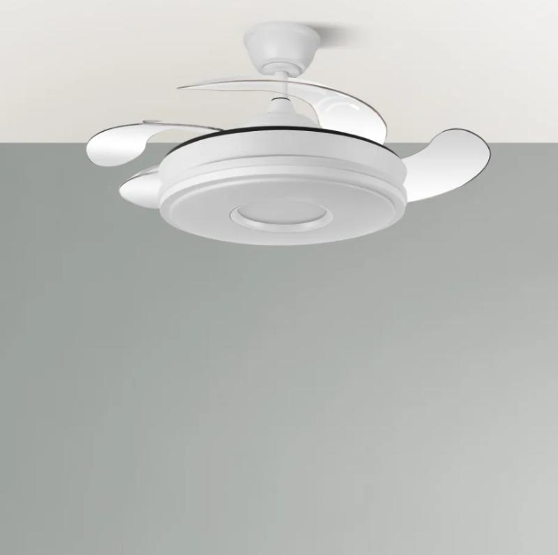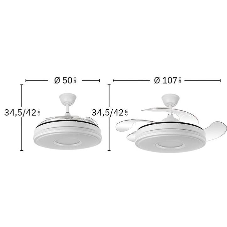 | Ventilador de Techo Dani Fabrilamp | Ventilador DC serie DANI realizado en metal, policarbonato, en color BLANCO con cuatro aspas DESPLEGABLES de ABS transparente muy resistentes. Tiene seis velocidades ajustables. Motor DC. Tecnología LED integrada con una potencia de 59W, con 3 TEMPERATURAS SELECCIONABLES DE LUZ (3000-4000-6000K) luz cálida, natural y blanco frío, y 6980 lúmenes. Control de aire verano o invierno. Su medida es de 34,5/42X50 centímetros con las aspas plegadas y de 34,5/42X107 centímetros con las aspas desplegadas. Incluye dos tijas de 12,5 y 20 centímetros, para instalar a distintas alturas. Mando a distancia INCLUIDO, REGULABLE EN INTENSIDAD, con MEMORIA DE COLOR incorporada y TEMPORIZADOR 2/4 H. Modelo disponible en color cuero, blanco, negro y níquel, además de en dos tamaños diferentes. | Caracteristicas Ventilador Dani Fabrilamp | Materiales | - Base Motor: Metal - Aspas: Acrílicas - Difusor inferior: Policarbonato y metal | | Tonalidad de Metal | Blanco | Accionado mediante | Mando a distancia. | Programador de apagado | Sí. 2, y 4 horas. | Numero de Aspas | 4 | Tonalidad de Aspas | Transparentes | Motor Tipo | DC - Bajo Consumo | Velocidades | 6 | Consumo / Flujo aire Revoluciones / Sonoridad | - 1ª velocidad: 7w - 3378m3 - 160 rpm - 20 dB - 2ª velocidad: 12w - 4323m3 - 180 rpm - 25 dB - 3ª velocidad: 17w - 5702m3 - 190 rpm - 30 dB - 4ª velocidad: 22w - 6898m3 - 200 rpm - 35 dB - 5ª velocidad: 27w - 7963m3 - 220 rpm - 40 dB - 6ª velocidad: 32w - 8958m3 - 240 rpm - 45 dB | Función Invierno | Sí | Luz | Si - Luz LED de 59W - Regulable en intensidad | Datos de Luz | 6980 lúmenes | | Tonalidad de la Luz | Seleccionable (3000-4000-6000k) Con Memoria | Posible montaje sin Barra | No | Posible montaje en techo inclinado | Sí* | Grafico de medidas Ventilador Dani Fabrilamp |