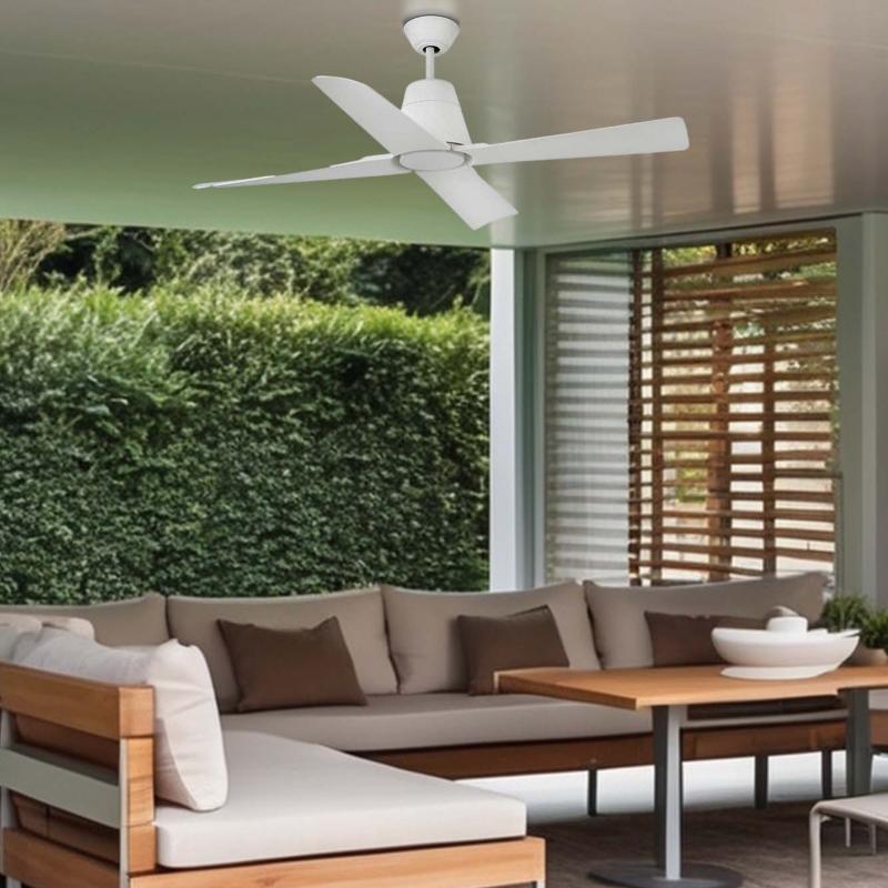 Materiales | - Base Motor: Acero - Aspas: ABS | | Tonalidad de Metal | Blanco Mate | Accionado mediante | Mando a distancia. | Programador de apagado | No | Numero de Aspas | 4 | Tonalidad de Aspas | Blanco | Motor Tipo | DC - Corriente Continua | Velocidades | 6 | Velocidades / Consumo | - 1ª velocidad: 50 rpm - 3w - 2ª velocidad: 71 rpm - 5w - 3ª velocidad: 93 rpm - 8w - 4ª velocidad: 115 rpm - 12w - 5ª velocidad: 138 rpm - 21w - 6ª velocidad: 162 rpm - 31w | | Flujo de Aire | 183 m3 | Función Invierno | Si. | Luz | No. | Posible montaje sin Barra | No | Posible montaje en techo inclinado | Si* | Grafico de medidas Ventilador Typhoon Faro | Guardar