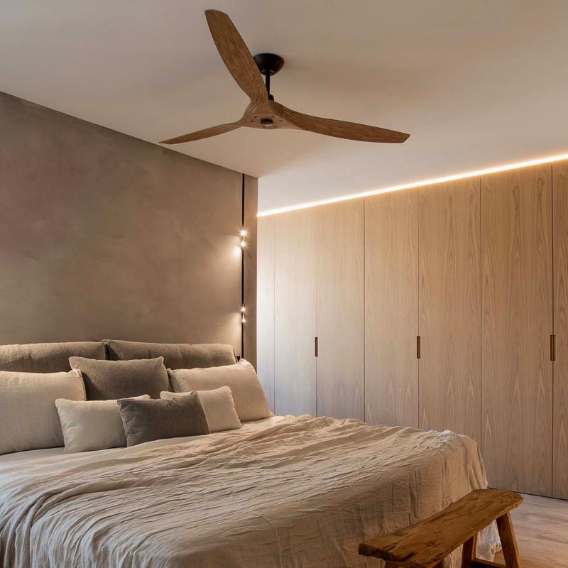 | | Ventilador de Techo Morea | El ventilador Morea destaca por su linea moderna y por sus poderosas aspas, que generan un flujo de aire impresionante. Esta realizado en acero con palas en ABS. Monta un motor DC bajo consumo de de ultima generación, mayor caudal de aire a menor numero de revoluciones, consiguiendo alargar notablemente la vida útil del motor, con un nivel de silencio casi absoluto. Accionado por mando a distancia de 5 velocidades. Este ventilador es apto para para techo inclinado. | Caracteristicas Ventilador Morea Faro | Materiales | - Base Motor: Acero - Aspas: ABS | | Tonalidad de Metal | Marron | Accionado mediante | Mando a distancia. | Programador de apagado | Si. 1,4 y 8 horas | Numero de Aspas | 3 | Tonalidad de Aspas | Madera Clara | Motor Tipo | DC - Bajo Consumo | Velocidades | 5 | Velocidades / Consumo | - 1ª velocidad: 58 rpm - 3w - 2ª velocidad: 105 rpm - 7w - 3ª velocidad: 131 rpm - 12w - 4ª velocidad: 148 rpm - 17w - 5ª velocidad: 195 rpm - 38w | Función Invierno | Si. Activada en el mando. | Flujo de aire | 211 m3 | Luz | No | Posible montaje sin Barra | No | Posible montaje en techo inclinado | Si* | | Peso | 5.45 kg | Grafico de medidas Ventilador Morea Faro |