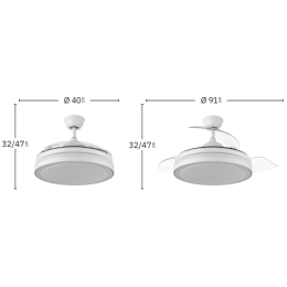 | | | Ventilador de Techo Escorpion Mini Fabrilamp | | Ventilador DC serie ESCORPION MINI realizado en metal, ABS y policarbonato, en color BLANCO con tres aspas DESPLEGABLES en ABS muy resistentes. Tiene seis velocidades ajustables. Motor DC. Tecnología LED integrada con una potencia de 59W, con 3 TEMPERATURAS SELECCIONABLES DE LUZ (3000-4000-6000K), luz cálida, natural y blanco frío, y 6980 lúmenes. Control de aire verano o invierno. Su medida es de 32/47X39 centímetros con las aspas plegadas y de 32/47X91 centímetros con las aspas desplegadas. Incluye dos tijas de 10 y 25 centímetros. Con mando a distancia INCLUIDO, MEMORIA DE COLOR incorporada y TEMPORIZADOR 2/4 H. Modelo disponible en dos tamaños. | Caracteristicas Ventilador Escorpion Mini Fabrilamp | Materiales | - Base Motor: Metal - Aspas: ABS - Difusor inferior: Policarbonato | | Tonalidad de Metal | Blanco | Accionado mediante | Mando a distancia. | Programador de apagado | Sí. 1, 2, y 4 horas. | Numero de Aspas | 3 | Tonalidad de Aspas | Transparentes | Motor Tipo | DC - Bajo Consumo | Velocidades | 6 | Consumo / Flujo aire Revoluciones / Sonoridad | - 1ª velocidad: 7w - 2752m3/hora - 170 rpm - 34.3 dB - 2ª velocidad: 12w - 3508m3/hora - 190 rpm - 35.1 dB - 3ª velocidad: 17w - 4611m3/hora - 210 rpm - 35.9 dB - 4ª velocidad: 22w - 5568m3/hora - 230 rpm - 37.2 dB - 5ª velocidad: 27w - 6427m3/hora - 250 rpm - 38.3 dB - 6ª velocidad: 32w - 7216m3/hora - 270 rpm - 40 dB | Función Invierno | Sí | Luz | Si - Luz LED de 59w. | Datos de Luz | 6980 lúmenes | | Tonalidad de la Luz | Seleccionable (3000-4000-6000k) Con Memoria | Posible montaje sin Barra | No | Posible montaje en techo inclinado | No | Grafico de medidas Ventilador Escorpion Mini Fabrilamp |