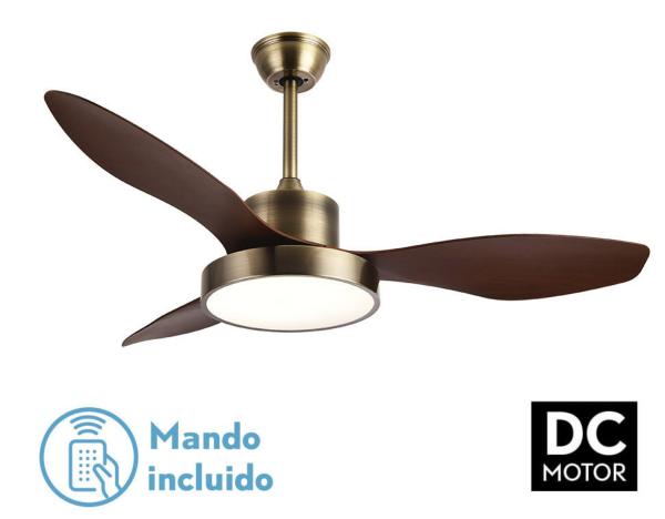 | Ventilador de Techo Hayate Fabrilamp | Ventilador Hayate realizado en metal, aspas de ABS y difusor de policarbonato. Equipado con motor DC de 6 velocidades manejado por mando a distancia con programador de apagado. Luz LED con selección de tonalidad: Fría - Neutra o Cálida. Incluye 2 barras para adaptar a la altura más idonea. Modelo también disponible en tonalidad de metal Marron, Niquel y Blanco. | Caracteristicas Ventilador Hayate Fabrilamp | Materiales | - Base Motor: Metal - Aspas: ABS - Difusor inferior: Policarbonato | | Tonalidad de Metal | Oro envejecido | Accionado mediante | Mando a distancia. | Programador de apagado | Sí | Numero de Aspas | 3 | Tonalidad de Aspas | Roble | Motor Tipo | DC - Bajo Consumo | Velocidades | 6 | Consumo / Flujo aire Revoluciones / Sonoridad | - 1ª velocidad: 12w - 2760m3/hora - 120 rpm - 20dB - 2ª velocidad: 15w - 3520m3/hora - 134 rpm - 25dB - 3ª velocidad: 19w - 4320m3/hora - 148 rpm - 30dB - 4ª velocidad: 24w - 5120m3/hora - 162 rpm - 35dB - 5ª velocidad: 30w - 5930m3/hora - 176 rpm - 40dB - 6ª velocidad: 35w - 6730m3/hora - 190 rpm - 45dB | Función Invierno | Si. Activada en el mando. | Luz | Si - Luz LED de 48w. | Datos de Luz | 4078 lumenes | | Tonalidad de la Luz | Seleccionable 3000,4000,6000k. Con Memoria | Posible montaje sin Barra | No | Posible montaje en techo inclinado | Sí* | Grafico de medidas Ventilador Hayate Fabrilamp |