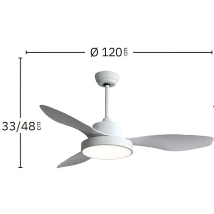 | Ventilador de Techo Hayate Fabrilamp | Ventilador Hayate realizado en metal, aspas de ABS y difusor de policarbonato. Equipado con motor DC de 6 velocidades manejado por mando a distancia con programador de apagado. Luz LED con selección de tonalidad: Fría - Neutra o Cálida. Incluye 2 barras para adaptar a la altura más idónea. Modelo también disponible en tonalidad de metal blanco, Cuero y Níquel. | Caracteristicas Ventilador Hayate Fabrilamp | Materiales | - Base Motor: Metal - Aspas: ABS - Difusor inferior: Policarbonato | | Tonalidad de Metal | Marrón | Accionado mediante | Mando a distancia. | Programador de apagado | Sí | Numero de Aspas | 3 | Tonalidad de Aspas | Marrón | Motor Tipo | DC - Bajo Consumo | Velocidades | 6 | Consumo / Flujo aire Revoluciones / Sonoridad | - 1ª velocidad: 12w - 2760m3/hora - 120 rpm - 20dB - 2ª velocidad: 15w - 3520m3/hora - 134 rpm - 25dB - 3ª velocidad: 19w - 4320m3/hora - 148 rpm - 30dB - 4ª velocidad: 24w - 5120m3/hora - 162 rpm - 35dB - 5ª velocidad: 30w - 5930m3/hora - 176 rpm - 40dB - 6ª velocidad: 35w - 6730m3/hora - 190 rpm - 45dB | Función Invierno | Si. Activada en el mando. | Luz | Si - Luz LED de 48w. | Datos de Luz | 4080 lumenes | | Tonalidad de la Luz | Seleccionable 3000,4000,6000k. Con Memoria | Posible montaje sin Barra | No | Posible montaje en techo inclinado | Sí* | Grafico de medidas Ventilador Hayate Fabrilamp |