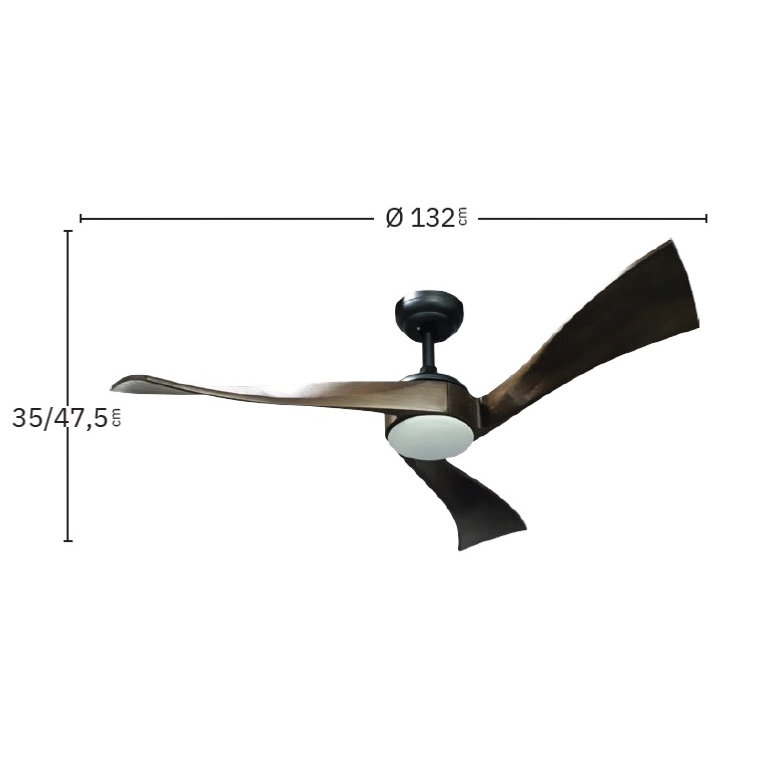 | |  | Ventilador de Techo Janubi Fabrilamp | | Ventilador serie JANUBI en color NEGRO y tres aspas en color ROBLE. Motor DC con seis velocidades. Tiene TECNOLOGÍA LED integrada con 22 watios de potencia , 2350 lúmenes y TRES TEMPERATURAS DE LUZ 3000-4000-6000k (cálida, blanco natural y blanco frío). Sus dimensiones son 35/47,5x132x132 centímetros, con dos medidas de tijas para diferentes alturas. Está realizado en metal, madera y policarbonato. MEMORIA DE COLOR, MANDO A DISTANCIA y TEMPORIZADOR INCLUIDO. Control de aire verano/invierno. | Caracteristicas Ventilador Janubi Fabrilamp | Materiales | - Base Motor: Metal - Aspas: Madera Natural - Difusor de luz: Policarbonato | | Tonalidad de Metal | Negro | Accionado mediante | Mando a distancia. | Programador de apagado | Sí | Numero de Aspas | 3 | Tonalidad de Aspas | Roble | Motor Tipo | DC - Bajo Consumo | Velocidades | 6 | Consumo / Flujo aire Revoluciones / Sonoridad | - 1ª velocidad: 8w - 3065m3/hora - 68 rpm - 18 dB - 2ª velocidad: 10w - 3575m3/hora - 84 rpm - 29.3 dB - 3ª velocidad: 14w - 4400m3/hora - 96 rpm - 31.8 dB - 4ª velocidad: 21w - 5050m3/hora - 109 rpm - 35.4 dB - 5ª velocidad: 29w - 6150m3/hora - 125 rpm - 38.5 dB - 6ª velocidad: 42w - 7040m3/hora - 140 rpm - 42.3 dB | Función Invierno | Si. Activada en el mando. | Luz | Sí | | Tipo de Luz | Tecnología LED integrado | | Potencia de Luz | 22w | | Lumenes | 2350 | | Tonalidad de la luz | Seleccionable 3000-4000-6000 / Semicálida, Neutra o Fría | Posible montaje sin Barra | No | Posible montaje en techo inclinado | Si* | Grafico de medidas Ventilador Janubi Fabrilamp |