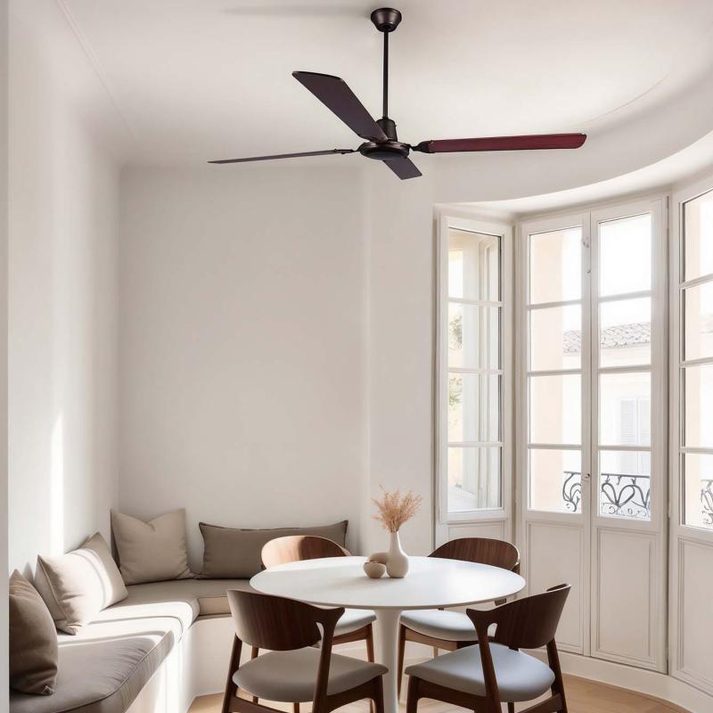 Materiales | - Base Motor: Acero - Aspas: Madera MDF | | Tonalidad de Metal | Marrón | Accionado mediante | Regulador de pared. | Programador de apagado | Sí | Numero de Aspas | 4 | Tonalidad de Aspas | Caoba - Reversibles | Motor Tipo | AC - Corriente Alterna | Velocidades | 5 | Velocidades / Consumo | - 1ª velocidad: 111 rpm - 24w - 2ª velocidad: 145 rpm - 37w - 3ª velocidad: 170 rpm - 48w - 4ª velocidad: 187 rpm - 57w - 5ª velocidad: 229 rpm - 80w | | Flujo de Aire | 176 m3 | Función Invierno | Sí | Luz | No | Posible montaje sin Barra | No | Posible montaje en techo inclinado | Sí* | Grafico de medidas Ventilador Malvinas Faro |