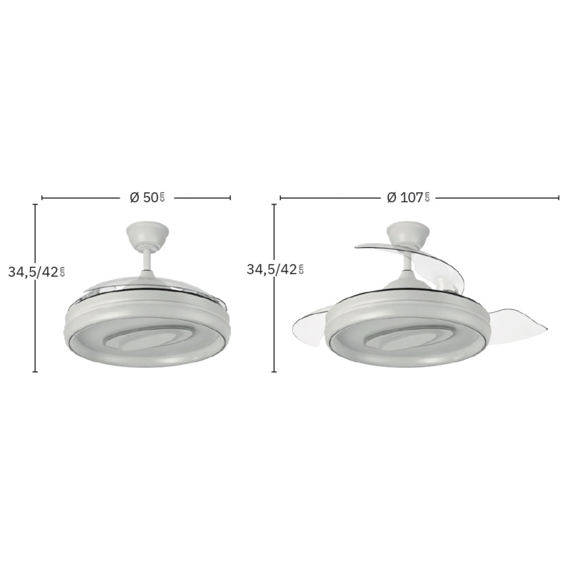 | Ventilador de Techo Maracaná Fabrilamp | | Ventilador DC de la serie MARACANÁ realizado en metal, policarbonato y ABS, en color NEGRO con tres aspas DESPLEGABLES de ABS transparente muy resistentes. Diseño muy moderno y original, con bonito juego de luces. Tiene seis velocidades ajustables. Tecnología LED integrada con una potencia de 57W, con 3 TEMPERATURAS SELECCIONABLES DE LUZ (3000-4500-6500K) y 5980 lúmenes. Control de aire verano o invierno. Su medida es de 34,5/42X50 centímetros con las aspas plegadas y de 34,5/42X107 centímetros con las aspas desplegadas. Incluye dos tijas de 12,5 y 20 centímetros, para colocar a distintas alturas. Mando a distancia INCLUIDO, REGULABLE EN INTENSIDAD, con MEMORIA DE COLOR incorporada y TEMPORIZADOR 2/4 H. Puede utilizar el control VIA APP : FAN LAMP PRO, desde el que podrá manejar también su ventilador de manera fácil e intuitiva desde su móvil. Modelo disponible en color blanco y en negro. | Caracteristicas Ventilador Maracaná Fabrilamp | Materiales | - Base Motor: Metal - Aspas: Acrílicas - Difusor inferior: Policarbonato | | Tonalidad de Metal | Negro | Accionado mediante | Mando a distancia. | Programador de apagado | Sí. 2, y 4 horas. | Numero de Aspas | 3 | Tonalidad de Aspas | Transparentes | Motor Tipo | DC - Bajo Consumo | Velocidades | 6 | Consumo / Flujo aire Revoluciones / Sonoridad | - 1ª velocidad: 7w - 3754m3/hora - 160 rpm - 20 dB - 2ª velocidad: 12w - 4803m3/hora - 170 rpm - 25 dB - 3ª velocidad: 17w - 6336m3/hora - 180 rpm - 30 dB - 4ª velocidad: 22w - 7665m3/hora - 190 rpm - 35 dB - 5ª velocidad: 27w - 8848m3/hora - 200 rpm - 40 dB - 6ª velocidad: 32w - 9953m3/hora - 210 rpm - 45 dB | Función Invierno | Sí | Luz | Si - Luz LED de 57w. | Datos de Luz | 5980 lúmenes - Regulable | | Tonalidad de la Luz | Seleccionable (3000-4500-6500k) Con Memoria | Posible montaje sin Barra | No | Posible montaje en techo inclinado | Sí* | Grafico de medidas Ventilador Maracaná Fabrilamp |