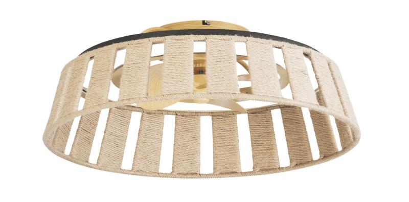 | Ventilador de Techo Mim Forlight | | Ventilador IP44 MIM LED TW 2700-6000K imitación madera Negro 4370 El ventilador de techo con luz LED Mim tiene un motor DC ultrasilencioso y de bajo consumo. Su pantalla de cuerda trenzada le aporta una estética natural, de estilo boho-chic. Encaja en dormitorios y salones de un tamaño de hasta 9m2. Cuenta con una protección IP44, por lo que es apto también para uso exterio en terrazas y porches. Su mando a distancia permite encender-apagar, escoger entre 6 velocidades, regular la intensidad y temperatura de luz (2700-6000K) y programar su apagado con temporizador, una función ideal para las noches de verano. Además, incorpora dos modos adicionales: modo brisa y modo invierno con giro inverso, con el que lograrás distribuir el aire cálido de tu hogar eficientemente y reducir tus gastos en calefacción. Su estructura ha sido fabricada en acero, y sus 3 aspas son de acrílico, con un acabado de madera clara. | Caracteristicas Ventilador Mim Forlight | Materiales | - Base Motor: Acero - Aspas: ABS - Difusor inferior: Acrílico | | Tonalidad de Metal | - Decorado efecto madera | Accionado mediante | - Mando a distancia | Programador de apagado | Sí | Numero de Aspas | 3 | | Tonalidad de Aspas | Decorado efecto madera | Motor Tipo | DC - Corriente Continua | Velocidades | 6 | Velocidades / Consumo | - 1¦ velocidad: 87 rpm / 6.8w - 2¦ velocidad: 107 rpm / 6w - 3¦ velocidad: 127 rpm / 12w - 4¦ velocidad: 168 rpm / 19w - 5¦ velocidad: 204 rpm / 35w - 6¦ velocidad: 204 rpm / 35w | Función Invierno | Si | Luz | Si | Fuente de Luz | Luz LED 28w | Datos de Luz | 2700 k - 6000b k - 4370 límenes. Luz seleccionable | Posible montaje sin Barra | No | Posible montaje en techo inclinado | No | Grafico de medidas Ventilador Mim Forlight |