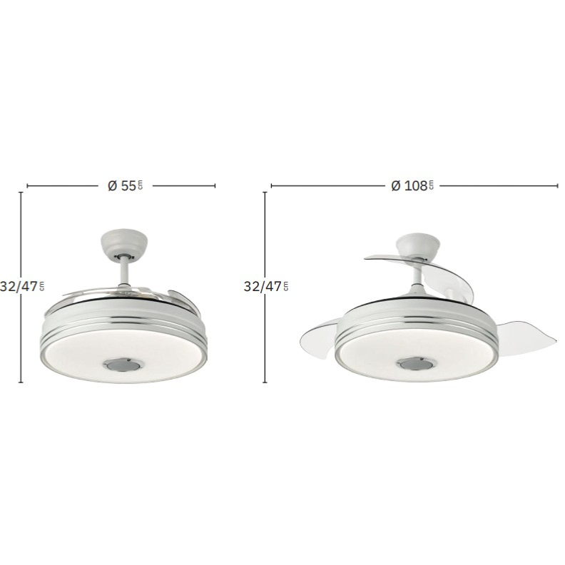 | Ventilador de Techo Musical Matanuska Fabrilamp | | Ventilador MATANUSKA de color BLANCO con cuatro aspas DESPLEGABLES de metacrilato muy resistentes de color transparente y seis velocidades. Motor DC .Realizado en metal, policarbonato y metacrilato. Tecnología LED integrada con una potencia de luz de 72 watios, 3600 lúmenes. De luz regulable (desde 3000, 4000, 6500 k). Control de aire para verano o invierno. Mando a distancia INCLUÍDO con MEMORIA DE COLOR incorporada y TEMPORIZADOR 1/2/4H. Con ALTAVOZ INCORPORADO y RECEPCIÓN BLUETOOTH . Su medida es de 32X55 centímetros con las aspas plegadas y de 32X108 centímetros con las aspas desplegadas. Modelo también disponible en Plata. | Caracteristicas Ventilador Musical Matanuska Fabrilamp | Materiales | - Base Motor: Metal - Aspas: Acrilicas - Difusor inferior: PMMA Opal | | Tonalidad de Metal | Blanco y cromo | Accionado mediante | Mando a distancia. | Programador de apagado | Sí, 1,2 y 4 horas. | Numero de Aspas | 3 | Tonalidad de Aspas | Transparentes | Motor Tipo | DC - Corriente Continua | Velocidades | 6 | Velocidades / Consumo | 1ª velocidad: 160 rpm / 7w / 3754 m3 / 20 dB 2ª velocidad: 180 rpm / 12w / 4803 m3 / 25 dB 3ª velocidad: 200 rpm / 17w / 6336 m3 / 30 dB 4ª velocidad: 220 rpm / 22w / 7665 m3 / 35 dB 5ª velocidad: 240 rpm / 27w / 8848 m3 / 40 dB 6ª velocidad: 260 rpm / 32w / 9953 m3 / 45 dB | Función Invierno | Si | Luz | Si - Luz LED SMD de 72w. | Datos de Luz | 3600 lumenes - 3000 - 4000k - 6500 k Seleccionable | Incluidas | Si | Posible montaje sin Barra | No | Posible montaje en techo inclinado | Si*. | Grafico de medidas Ventilador Musical Matanuska Fabrilamp |