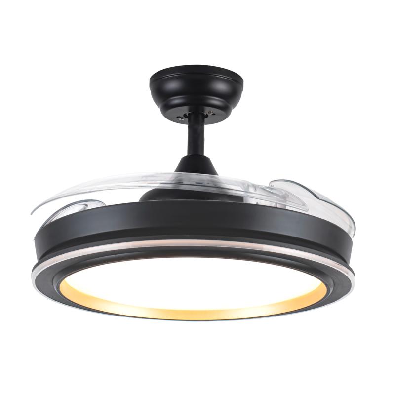 | Ventilador de Techo Picolo Fabrilamp | | Ventilador DC de la serie PICOLO realizado en metal, policarbonato y acrílicas, en color NEGRO/ORO con tres aspas DESPLEGABLES de ABS transparente muy resistentes. Tiene seis velocidades ajustables. Tecnología LED integrada con una potencia de 72W, con 3 TEMPERATURAS SELECCIONABLES DE LUZ (3000-4000-6000K) y 6226 lúmenes. Control de aire verano o invierno. Su medida es de 38/50,5X49,5 centímetros con las aspas plegadas y de 38/50,5X106 centímetros con las aspas desplegadas. Incluye dos tijas de 12,5 y 25 centímetros, para colocar a distintas alturas. Mando a distancia INCLUIDO con MEMORIA DE COLOR incorporada y TEMPORIZADOR 1/3/6 H. | Caracteristicas Ventilador Picolo Fabrilamp | Materiales | - Base Motor: Metal - Aspas: Acrílicas - Difusor inferior: Policarbonato | | Tonalidad de Metal | Negro | Accionado mediante | Mando a distancia. | Programador de apagado | Sí. 1, 2, y 4 horas. | Numero de Aspas | 3 | Tonalidad de Aspas | Transparentes | Motor Tipo | DC - Bajo Consumo | Velocidades | 6 | Consumo / Flujo aire Revoluciones / Sonoridad | - 1ª velocidad: 7w - 3754 m3/hora - 158 rpm - 29 dB - 2ª velocidad: 8.5w - 4803 m3/hora - 180 rpm - 34 dB - 3ª velocidad: 11.4w - 6336 m3/hora - 188 rpm - 36 dB - 4ª velocidad: 16w - 7665 m3/hora - 201 rpm - 40 dB - 5ª velocidad: 24.5w - 8848 m3/hora - 224 rpm - 43 dB - 6ª velocidad: 32w - 9956 m3/hora - 231 rpm - 46 dB | Función Invierno | Sí | Luz | Si - Luz LED de 72w. | Datos de Luz | 6226 lúmenes | | Tonalidad de la Luz | Seleccionable (3000-4000-6500k) Con Memoria | Posible montaje sin Barra | No | Posible montaje en techo inclinado | Sí* | Grafico de medidas Ventilador Picolo Fabrilamp |