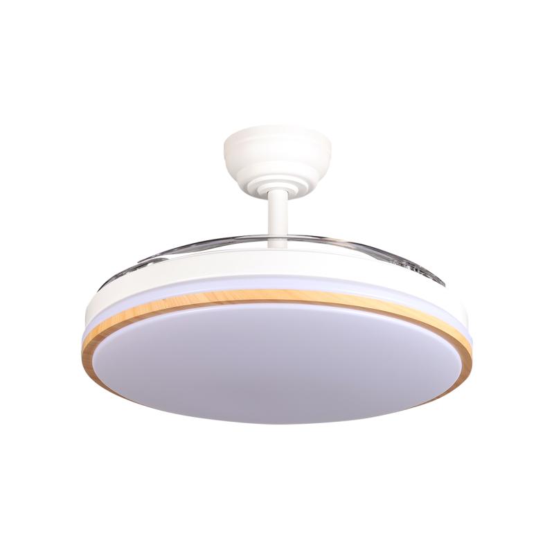 Ventilador DC de la serie RELAMPAGO realizado en metal, policarbonato y ABS, en color BLANCO y Haya con tres aspas DESPLEGABLES de ABS transparente muy resistentes. Diseño muy moderno y original. Tiene seis velocidades ajustables. Tecnología LED integrada con una potencia de 60W, con 3 TEMPERATURAS SELECCIONABLES DE LUZ (3000-4300-6500K) y 6980 lúmenes. Control de aire verano o invierno. Su medida es de 36X48X48 centímetros con las aspas plegadas y de 36X107X107 centímetros con las aspas desplegadas. Mando a distancia INCLUIDO, REGULABLE EN INTENSIDAD, con MEMORIA DE COLOR incorporada y TEMPORIZADOR 2H y 4H. Modelo disponible en color blanco y en color blanco/haya para elegir el que mejor le venga con su decoración.