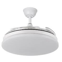 | Ventilador de Techo Tridente Fabrilamp | | Ventilador DC de la serie TRIDENTE realizado en metal, policarbonato y ABS, en color BLANCO con cuatro aspas DESPLEGABLES de ABS transparente muy resistentes. De diseño innovador, ideal para completar tanto en decoraciones modernas como clásicas, realizando tanto la función de lámpara como de ventilador. Motor DC con seis velocidades ajustables. Tecnología LED integrada con una potencia de 59W, 6980 lúmenes y 3 TEMPERATURAS SELECCIONABLES DE LUZ (3000-4000-6000K) luz cálida, natural y blanco frío. Es REGULABLE EN INTENSIDAD, con mando a distancia INCLUIDO con MEMORIA DE COLOR incorporada y TEMPORIZADOR 2/4 H. Control de aire verano o invierno. Su medida es de 34,5/42X50 centímetros con las aspas plegadas y de 34,5/42X107 centímetros con las aspas desplegadas. Incluye dos tijas de 12,5 y 20 centímetros, para colocar a distintas alturas. Encontramos en esta serie dos tamaños de ventiladores y en los colores blanco, negro, níquel y cuero, para elegir el más le guste y el que mejor se adapte a su decoración. | Caracteristicas Ventilador Tridente Fabrilamp | Materiales | - Base Motor: Metal - Aspas: Acrílicas - Difusor inferior: Policarbonato | | Tonalidad de Metal | Blanco | Accionado mediante | Mando a distancia. | Programador de apagado | Sí. 1, 2, y 4 horas. | Numero de Aspas | 3 | Tonalidad de Aspas | Transparentes | Motor Tipo | DC - Bajo Consumo | Velocidades | 6 | Consumo / Flujo aire Revoluciones / Sonoridad | - 1ª velocidad: 7w - 3378m3/hora - 160 rpm - 20 dB - 2ª velocidad: 12w - 4323m3/hora - 180 rpm - 25 dB - 3ª velocidad: 17w - 5702m3/hora - 190 rpm - 30 dB - 4ª velocidad: 22w - 6898m3/hora - 200 rpm - 35 dB - 5ª velocidad: 27w - 7963m3/hora - 220 rpm - 40 dB - 6ª velocidad: 32w - 8958m3/hora - 240 rpm - 45 dB | Función Invierno | Sí | Luz | Si - Luz LED de 59w. | Datos de Luz | 6980 lúmenes | | Tonalidad de la Luz | Seleccionable (3000-4000-6000k) Con Memoria | Posible montaje sin Barra | No | Posible montaje en techo inclinado | Sí* | Grafico de medidas Ventilador Tridente Fabrilamp |