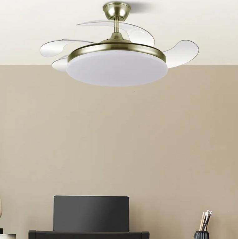 | Ventilador de Techo Tridente Fabrilamp | Ventilador DC de la serie TRIDENTE realizado en metal, policarbonato y ABS, en color CUERO con cuatro aspas DESPLEGABLES de ABS transparente muy resistentes. De diseño innovador, ideal para completar tanto en decoraciones modernas como clásicas, realizando tanto la función de lámpara como de ventilador. Motor DC con seis velocidades ajustables. Tecnología LED integrada con una potencia de 59W, 6980 lúmenes y 3 TEMPERATURAS SELECCIONABLES DE LUZ (3000-4000-6000K) luz cálida, natural y blanco frío. Es REGULABLE EN INTENSIDAD, con mando a distancia INCLUIDO con MEMORIA DE COLOR incorporada y TEMPORIZADOR 2/4 H. Control de aire verano o invierno. Su medida es de 34,5/42X50 centímetros con las aspas plegadas y de 34,5/42X107 centímetros con las aspas desplegadas. Incluye dos tijas de 12,5 y 20 centímetros, para colocar a distintas alturas. Encontramos en esta serie dos tamaños de ventiladores y en los colores blanco, negro, níquel y cuero, para elegir el más le guste y el que mejor se adapte a su decoración. | Caracteristicas Ventilador Tridente Fabrilamp | Materiales | - Base Motor: Metal - Aspas: Acrílicas - Difusor inferior: Policarbonato | | Tonalidad de Metal | Oro envejecido | Accionado mediante | Mando a distancia. | Programador de apagado | Sí. 2 y 4 horas. | Numero de Aspas | 4 | Tonalidad de Aspas | Transparentes | Motor Tipo | DC - Bajo Consumo | Velocidades | 6 | Consumo / Flujo aire Revoluciones / Sonoridad | - 1ª velocidad: 7w - 3378m3/hora - 160 rpm - 20 dB - 2ª velocidad: 12w - 4323m3/hora - 180 rpm - 25 dB - 3ª velocidad: 17w - 5702m3/hora - 190 rpm - 30 dB - 4ª velocidad: 22w - 6898m3/hora - 200 rpm - 35 dB - 5ª velocidad: 27w - 7963m3/hora - 220 rpm - 40 dB - 6ª velocidad: 32w - 8958m3/hora - 240 rpm - 45 dB | Función Invierno | Sí | Luz | Si - Luz LED de 59w. | Datos de Luz | 6980 lúmenes | | Tonalidad de la Luz | Seleccionable (3000-4000-6000k) Con Memoria | Posible montaje sin Barra | No | Posible montaje en techo inclinado | Sí* | Grafico de medidas Ventilador Tridente Fabrilamp |