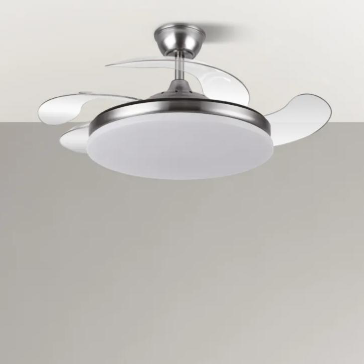 | Ventilador de Techo Tridente Fabrilamp | Ventilador DC de la serie TRIDENTE realizado en metal, policarbonato y ABS, en color NÍQUEL con cuatro aspas DESPLEGABLES de ABS transparente muy resistentes. De diseño innovador, ideal para completar tanto en decoraciones modernas como clásicas, realizando tanto la función de lámpara como de ventilador. Motor DC con seis velocidades ajustables. Tecnología LED integrada con una potencia de 59W, 6980 lúmenes y 3 TEMPERATURAS SELECCIONABLES DE LUZ (3000-4000-6000K) luz cálida, natural y blanco frío. Es REGULABLE EN INTENSIDAD, con mando a distancia INCLUIDO con MEMORIA DE COLOR incorporada y TEMPORIZADOR 2/4 H. Control de aire verano o invierno. Su medida es de 34,5/42X50 centímetros con las aspas plegadas y de 34,5/42X107 centímetros con las aspas desplegadas. Incluye dos tijas de 12,5 y 20 centímetros, para colocar a distintas alturas. Encontramos en esta serie dos tamaños de ventiladores y en los colores blanco, negro, níquel y cuero, para elegir el más le guste y el que mejor se adapte a su decoración. | Caracteristicas Ventilador Tridente Fabrilamp | Materiales | - Base Motor: Metal - Aspas: Acrílicas - Difusor inferior: Policarbonato | | Tonalidad de Metal | Níquel satinado | Accionado mediante | Mando a distancia. | Programador de apagado | Sí. 2 y 4 horas. | Numero de Aspas | 4 | Tonalidad de Aspas | Transparentes | Motor Tipo | DC - Bajo Consumo | Velocidades | 6 | Consumo / Flujo aire Revoluciones / Sonoridad | - 1ª velocidad: 7w - 3378m3/hora - 160 rpm - 20 dB - 2ª velocidad: 12w - 4323m3/hora - 180 rpm - 25 dB - 3ª velocidad: 17w - 5702m3/hora - 190 rpm - 30 dB - 4ª velocidad: 22w - 6898m3/hora - 200 rpm - 35 dB - 5ª velocidad: 27w - 7963m3/hora - 220 rpm - 40 dB - 6ª velocidad: 32w - 8958m3/hora - 240 rpm - 45 dB | Función Invierno | Sí | Luz | Si - Luz LED de 59w. | Datos de Luz | 6980 lúmenes | | Tonalidad de la Luz | Seleccionable (3000-4000-6000k) Con Memoria | Posible montaje sin Barra | No | Posible montaje en techo inclinado | Sí* | Grafico de medidas Ventilador Tridente Fabrilamp |