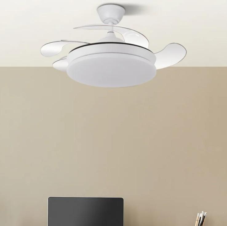 | Ventilador de Techo Tridente Mini Fabrilamp | Ventilador DC de la serie TRIDENTE MINI realizado en metal, policarbonato y ABS, en color BLANCO con cuatro aspas DESPLEGABLES de ABS transparente muy resistentes. De diseño innovador, ideal para completar tanto en decoraciones modernas como clásicas, realizando tanto la función de lámpara como de ventilador. Motor DC con seis velocidades ajustables. Tecnología LED integrada con una potencia de 59W, 6980 lúmenes y 3 TEMPERATURAS SELECCIONABLES DE LUZ (3000-4000-6000K) luz cálida, natural y blanco frío. Es REGULABLE EN INTENSIDAD, con mando a distancia INCLUIDO con MEMORIA DE COLOR incorporada y TEMPORIZADOR 2/4 H. Control de aire verano o invierno. Su medida es de 34,5/42X40 centímetros con las aspas plegadas y de 34,5/42X91 centímetros con las aspas desplegadas. Incluye dos tijas de 12,5 y 20 centímetros, para colocar a distintas alturas. Encontramos en esta serie dos tamaños de ventiladores y en los colores blanco, negro, níquel y cuero, para elegir el más le guste y el que mejor se adapte a su decoración.. | Características Ventilador Tridente Mini Fabrilamp | Materiales | - Base Motor: Metal - Aspas: Acrílicas - Difusor inferior: Policarbonato y metal | | Tonalidad de Metal | Blanco | Accionado mediante | Mando a distancia. | Programador de apagado | Sí. 2 y 4 horas. | Numero de Aspas | 4 | Tonalidad de Aspas | Transparentes | Motor Tipo | DC - Bajo Consumo | Velocidades | 6 | Consumo / Flujo aire Revoluciones / Sonoridad | - 1ª velocidad: 7w - 2702 m3 - 170 rpm - 34.3 dB - 2ª velocidad: 12w - 3458 m3 - 190 rpm - 35.1 dB - 3ª velocidad: 17w 4561 m3 - 210 rpm - 35.9 dB - 4ª velocidad: 22w - 5518 m3- 230 rpm - 37.2 dB - 5ª velocidad: 27w - 6370 m3 - 250 rpm - 38.3 dB - 6ª velocidad: 32w - 7166 m3 - 270 rpm - 40 dB | Función Invierno | Sí | Luz | Si - Luz LED de 59w. | Datos de Luz | 6980 lúmenes | | Tonalidad de la Luz | Seleccionable (3000-4000-6000k) Regulable en intensidad. | Posible montaje sin Barra | No | Posible montaje en techo inclinado | Sí* | Grafico de medidas Ventilador Tridente Mini Fabrilamp |