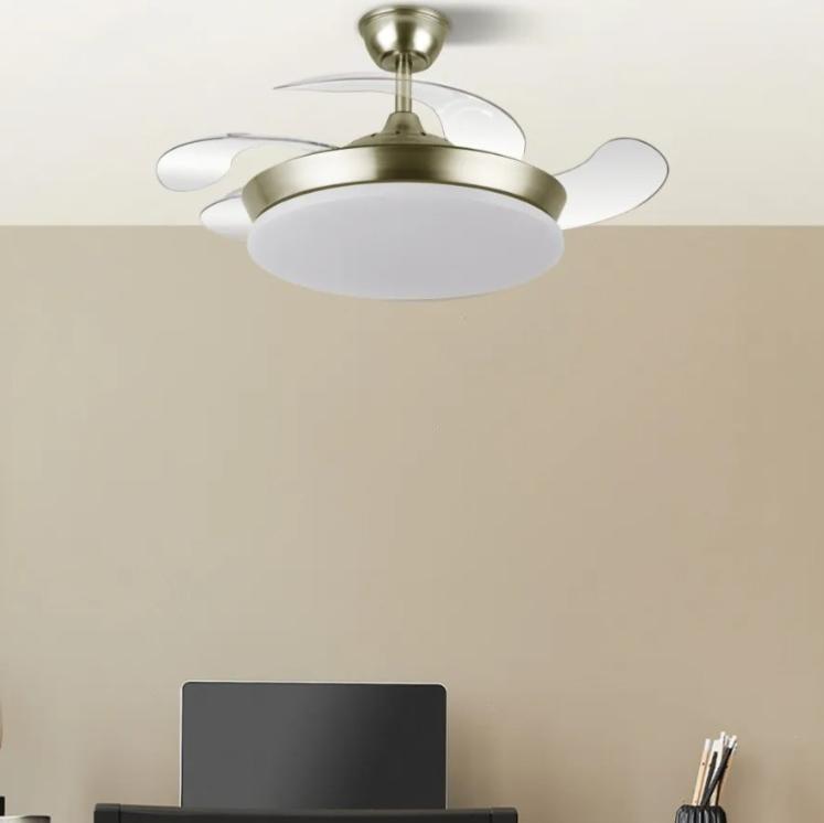 | Ventilador de Techo Tridente Mini Fabrilamp | Ventilador DC de la serie TRIDENTE MINI realizado en metal, policarbonato y ABS, en color CUERO con cuatro aspas DESPLEGABLES de ABS transparente muy resistentes. De diseño innovador, ideal para completar tanto en decoraciones modernas como clásicas, realizando tanto la función de lámpara como de ventilador. Motor DC con seis velocidades ajustables. Tecnología LED integrada con una potencia de 59W, 6980 lúmenes y 3 TEMPERATURAS SELECCIONABLES DE LUZ (3000-4000-6000K) luz cálida, natural y blanco frío. Es REGULABLE EN INTENSIDAD, con mando a distancia INCLUIDO con MEMORIA DE COLOR incorporada y TEMPORIZADOR 2/4 H. Control de aire verano o invierno. Su medida es de 34,5/42X40 centímetros con las aspas plegadas y de 34,5/42X91 centímetros con las aspas desplegadas. Incluye dos tijas de 12,5 y 20 centímetros, para colocar a distintas alturas. Encontramos en esta serie dos tamaños de ventiladores y en los colores blanco, negro, níquel y cuero, para elegir el más le guste y el que mejor se adapte a su decoración.. | Características Ventilador Tridente Mini Fabrilamp | Materiales | - Base Motor: Metal - Aspas: Acrílicas - Difusor inferior: Policarbonato y metal | | Tonalidad de Metal | Oro envejecido | Accionado mediante | Mando a distancia. | Programador de apagado | Sí. 1, 2, y 4 horas. | Numero de Aspas | 4 | Tonalidad de Aspas | Transparentes | Motor Tipo | DC - Bajo Consumo | Velocidades | 6 | Consumo / Flujo aire Revoluciones / Sonoridad | - 1ª velocidad: 7w - 2702 m3 - 170 rpm - 34.3 dB - 2ª velocidad: 12w - 3458 m3 - 190 rpm - 35.1 dB - 3ª velocidad: 17w - 4561 m3 - 210 rpm - 35.9 dB - 4ª velocidad: 22w - 5518 m3- 230 rpm - 37.2 dB - 5ª velocidad: 27w - 6370 m3 - 250 rpm - 38.3 dB - 6ª velocidad: 32w - 7166 m3 - 270 rpm - 40 dB | Función Invierno | Sí | Luz | Si - Luz LED de 59w. | Datos de Luz | 6980 lúmenes | | Tonalidad de la Luz | Seleccionable (3000-4000-6000k) Regulable en intensidad. | Posible montaje sin Barra | No | Posible montaje en techo inclinado | Sí* | Grafico de medidas Ventilador Tridente Mini Fabrilamp |