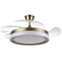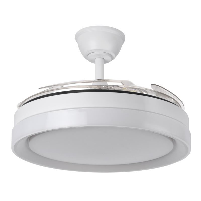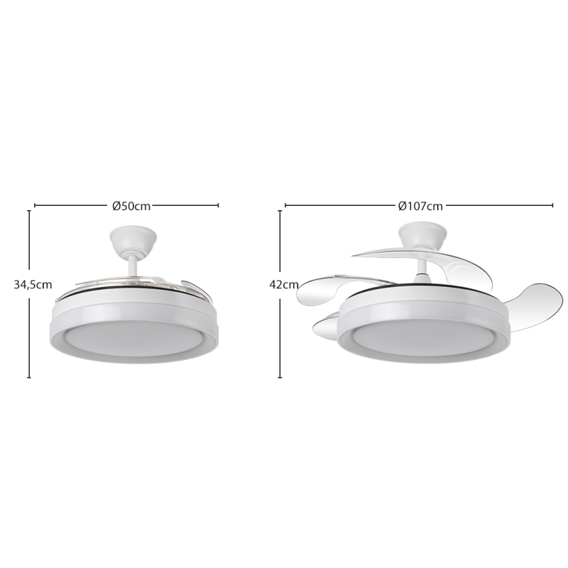 | Ventilador DC de la serie ZENIT en color BLANCO con cuatro aspas DESPLEGABLES muy resistentes. Realizado en metal, ABS y policarbonato, de diseño moderno, muy original y elegante. Tiene seis velocidades ajustables. Motor DC. Tecnología LED integrada con una potencia de 59W, 69800 lúmenes y 3 TEMPERATURAS SELECCIONABLES DE LUZ (3000-4000-6000K), luz cálida, luz natural y blanco frío. Control de aire verano o invierno. Su medida es de 34,5/42X50 centímetros con las aspas plegadas y de 34,5/42X107 centímetros con las aspas desplegadas, viene con DOS MEDIDAS DE TIJA para colocar a distintas alturas de techo. Mando a distancia INCLUIDO, REGULABLE EN INTENSIDAD, con MEMORIA DE COLOR y TEMPORIZADOR 2/4 H. Modelo disponible en color cuero, blanco y níquel. |