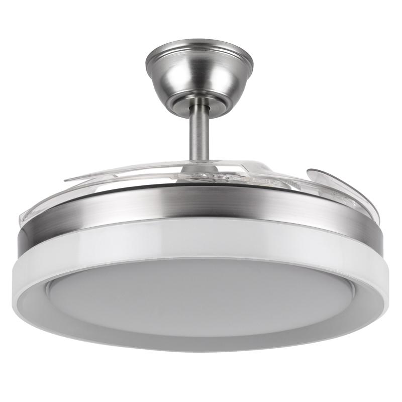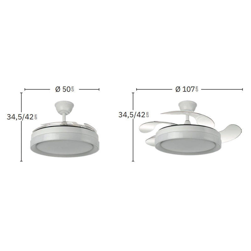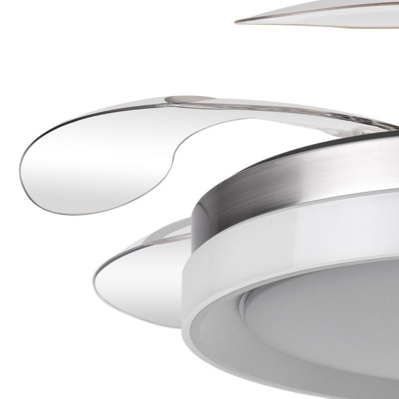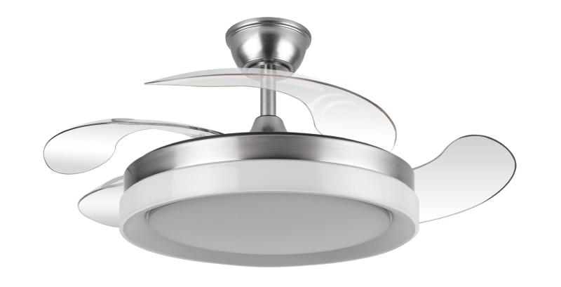 | Ventilador de Techo Zenit Fabrilamp | | Ventilador DC de la serie ZENIT en color NÍQUEL con cuatro aspas DESPLEGABLES muy resistentes. Realizado en metal, ABS y policarbonato, de diseño moderno, muy original y elegante. Tiene seis velocidades ajustables. Motor DC. Tecnología LED integrada con una potencia de 59W, 69800 lúmenes y 3 TEMPERATURAS SELECCIONABLES DE LUZ (3000-4000-6000K), luz cálida, luz natural y blanco frío. Control de aire verano o invierno. Su medida es de 34,5/42X50 centímetros con las aspas plegadas y de 34,5/42X107 centímetros con las aspas desplegadas, viene con DOS MEDIDAS DE TIJA para colocar a distintas alturas de techo. Mando a distancia INCLUIDO, REGULABLE EN INTENSIDAD, con MEMORIA DE COLOR y TEMPORIZADOR 2/4 H. Modelo disponible en color cuero, blanco y níquel. | Caracteristicas Ventilador Zenit Fabrilamp | Materiales | - Base Motor: Metal - Aspas: Acrílicas - Difusor inferior: Policarbonato | | Tonalidad de Metal | Níquel satinado | Accionado mediante | Mando a distancia. | Programador de apagado | Sí. 2, y 4 horas. | Numero de Aspas | 4 | Tonalidad de Aspas | Transparentes | Motor Tipo | DC - Bajo Consumo | Velocidades | 6 | Consumo / Flujo aire Revoluciones / Sonoridad | - 1ª velocidad: 7w - 3378m3/hora - 160 rpm - 20 dB - 2ª velocidad: 12w - 4323m3/hora - 180 rpm - 25 dB - 3ª velocidad: 17w - 5702m3/hora - 190 rpm - 30 dB - 4ª velocidad: 22w - 6898m3/hora - 200 rpm - 35 dB - 5ª velocidad: 27w - 7963m3/hora - 220 rpm - 40 dB - 6ª velocidad: 32w - 8958m3/hora - 240 rpm - 45 dB | Función Invierno | Sí | Luz | Si - Luz LED de 59w. | Datos de Luz | 6980 lúmenes | | Tonalidad de la Luz | Seleccionable (3000-4000-6000k) Con Memoria | Posible montaje sin Barra | No | Posible montaje en techo inclinado | Sí* | Grafico de medidas Ventilador Zenit Fabrilamp |